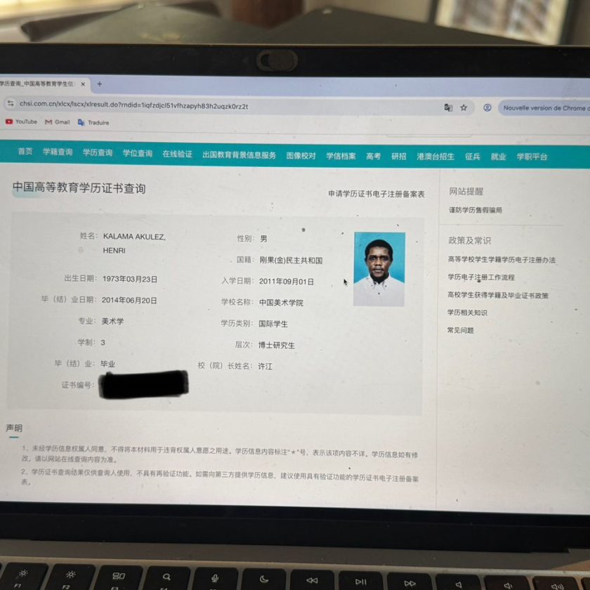 D’après les documents consultés par notre rédaction, Henri Kalama, reconnu pour sa probité et son professionnalisme a bel et bien étudié pendant trois ans en Chine, au sein de la China Academy of Art. Selon les informations recoupées via le site officiel de l’académie (chsi.com.cn) et par échanges directs avec l’institution à l’adresse officielle caaic@163.com, Henri Kalama est blanc comme neige. L’académie chinoise nous a fourni l’enregistrement officiel de Kalama ainsi que la date d’obtention de son diplôme, confirmant la validité de son parcours académique. Elle précise toutefois que le numéro du diplôme reste confidentiel et qu’un accès complet aux dossiers est réservé uniquement aux étudiants via un processus sécurisé, complexe et strictement encadré.